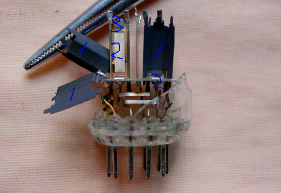 这是颗用于高频放大的通用双三极管6N1。1是吸气剂;2是灯丝阴极和栅极的组合体;3就是阳极。